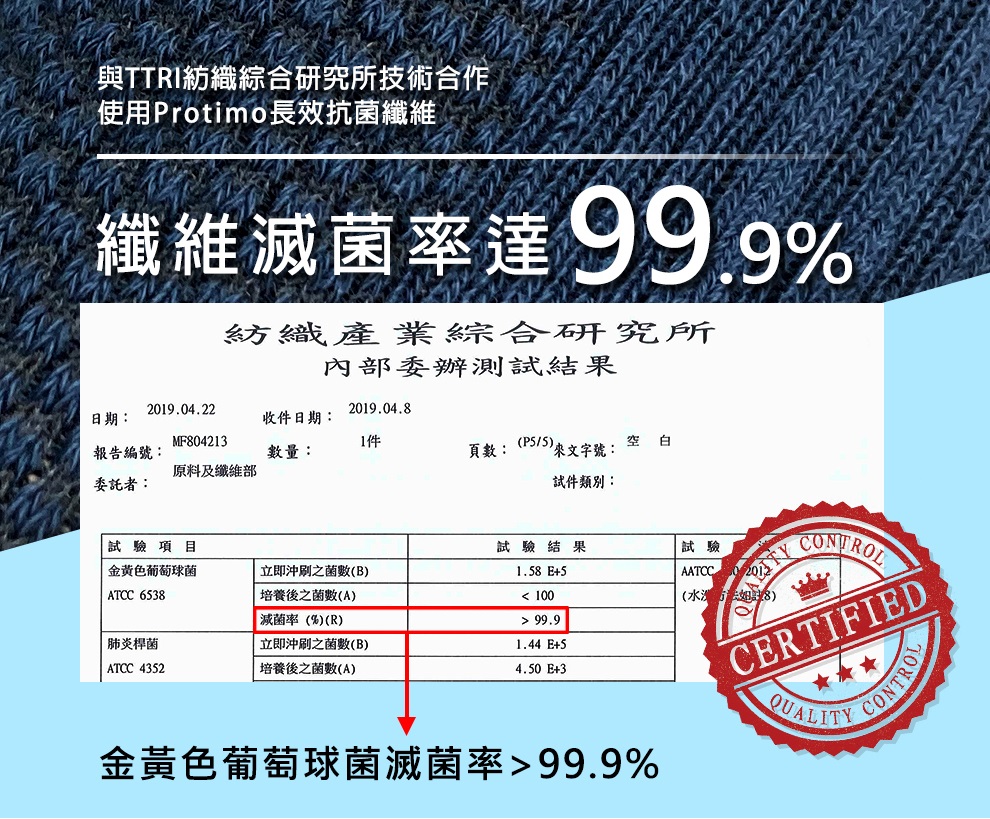 與TTRI紡織綜合研究所技術合作,使用Protimo長效抗菌纖維,有效抑制細菌孳生,防止異味產生。